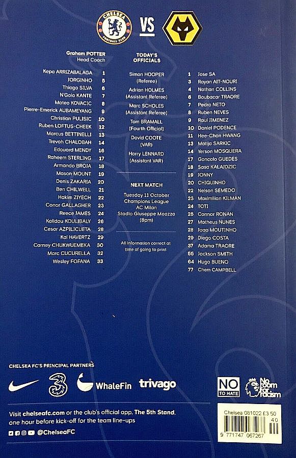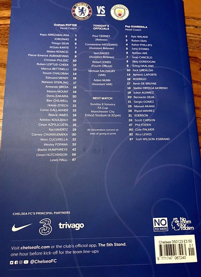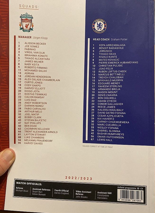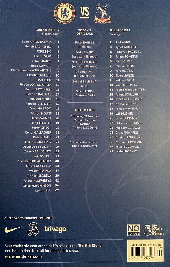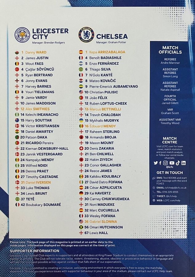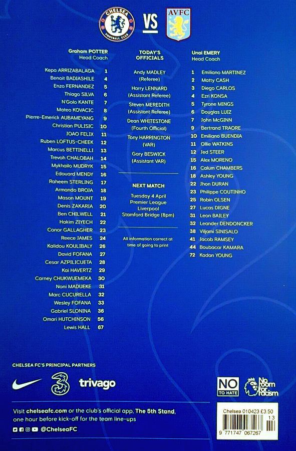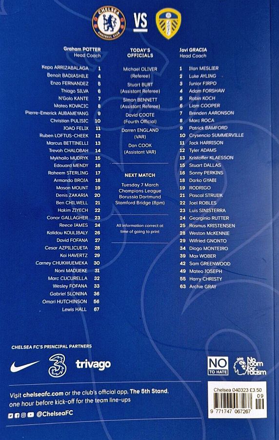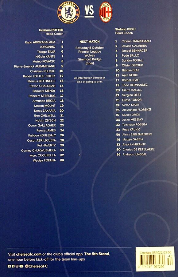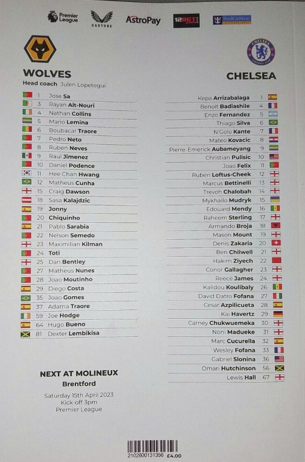 1 Kepa, 5 Enzo Fernandez (17 Raheem Sterling 67), 6 Thiago Silva, 7 N'Golo Kante, 8 Mateo Kovacic, 14 Trevoh Chalobah, 23 Conor Gallagher (11 Joao Felix 67), 24 Reece James, 29 Kai Havertz (19 Mason Mount 77), 32 Marc Cucurella (15 Mykhailo Mudryk 68), 33 Wesley Fofana |