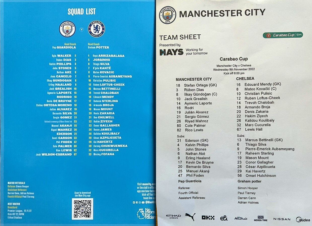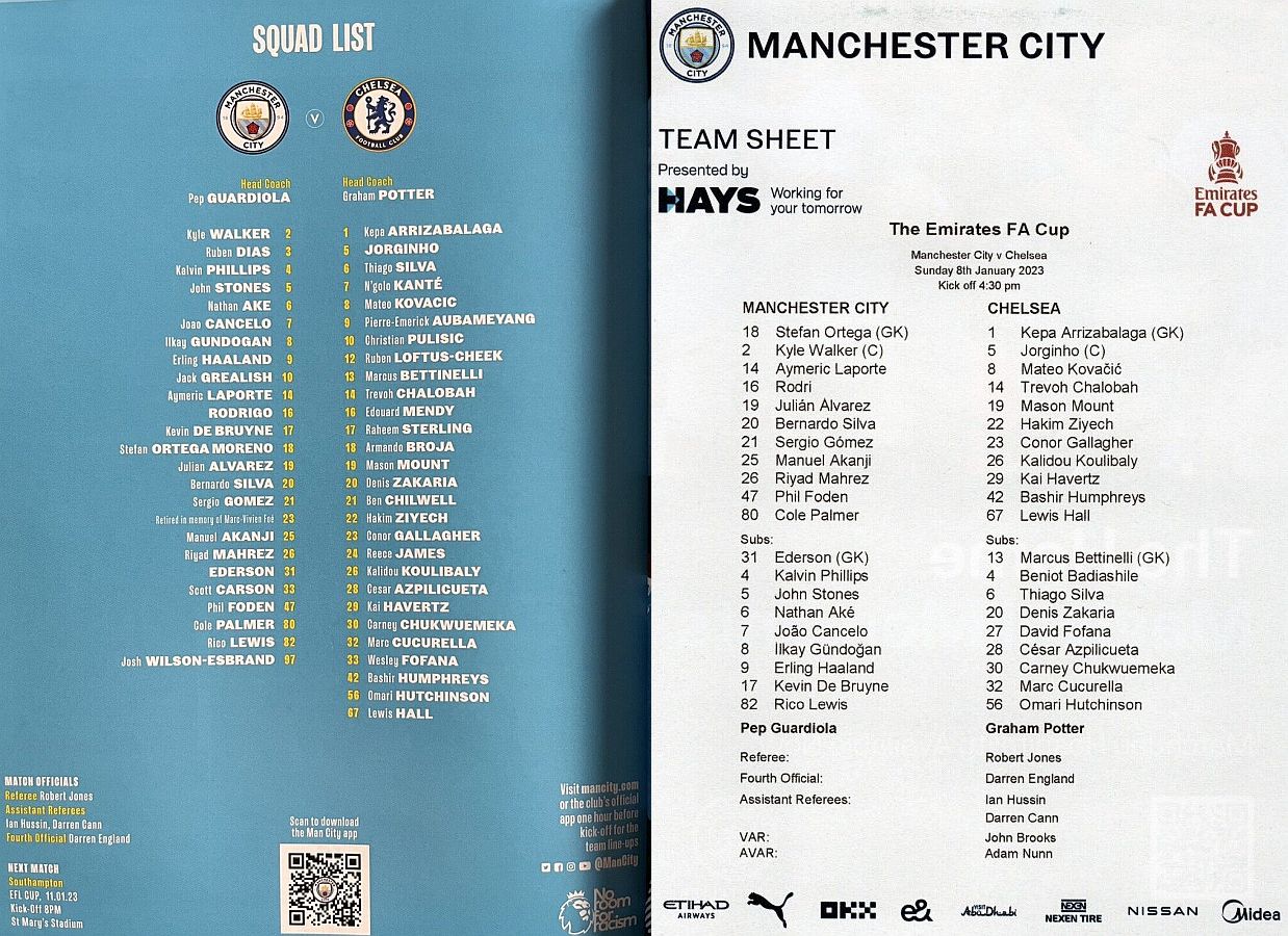1 Kepa, 5 Enzo Fernandez, 6 Thiago Silva, 12 Ruben Loftus-Cheek (30 Carney Chukwuemeka 81), 14 Trevoh Chalobah, 17 Raheem Sterling (31 Noni Madueke 69), 23 Conor Gallagher (15 Mykhailo Mudryk 69), 28 Cesar Azpilicueta, 29 Kai Havertz (10 Christian Pulisic 85), 33 Wesley Fofana, 67 Lewis Hall (26 Kalidou Koulibaly 81) |