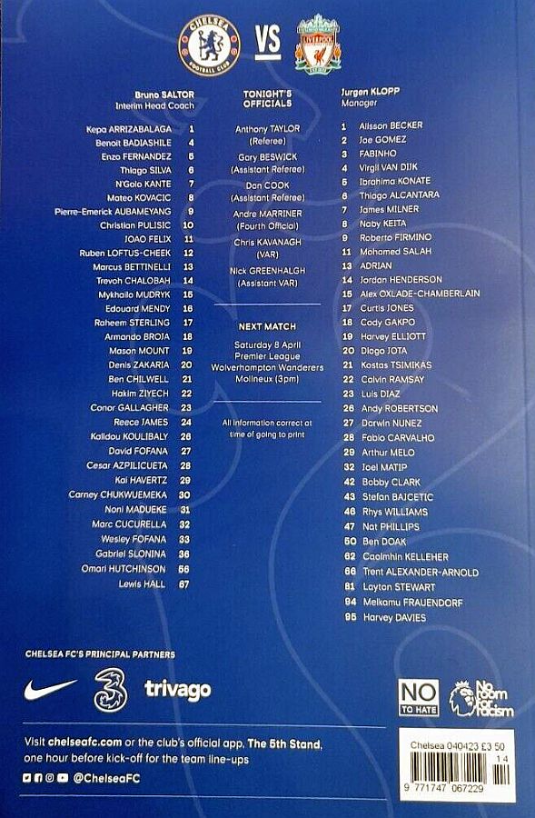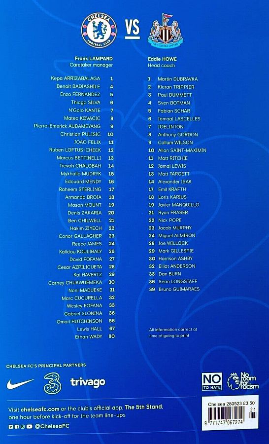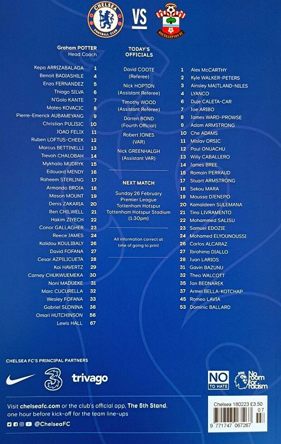 1 Kepa, 5 Enzo Fernandez, 14 Trevoh Chalobah, 15 Mykhailo Mudryk (10 Christian Pulisic 64), 23 Conor Gallagher (27 David Fofana 82), 28 Cesar Azpilicueta, 29 Kai Havertz (11 Joao Felix 64), 30 Carney Chukwuemeka (12 Ruben Loftus-Cheek 82), 31 Noni Madueke (22 Hakim Ziyech 82), 33 Wesley Fofana, 67 Lewis Hall |