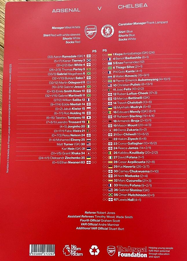 Aaron Ramsdale, Ben White, Gabriel (Rob Holding 85), Jakub Kiwior, Olexsandr Zinchenko (Reiss Nelson 73), Jorginho (Thomas Partey 86), Martin Odegaard, Granit Xhaka, Bukayo Saka (Marc Tierney 73), Gabriel Jesus, Leandro Trossard (Gabriel Martinelli 59) |