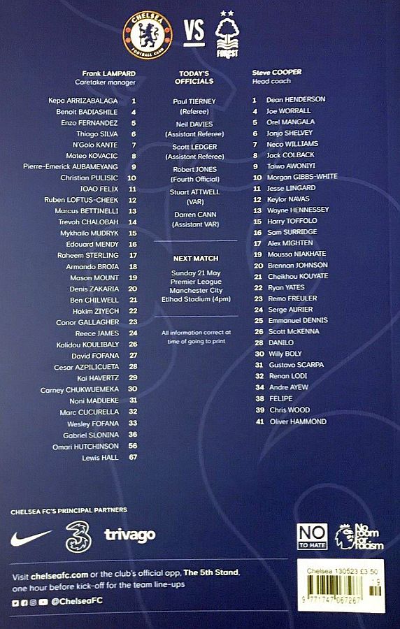 1 Kepa, 8 Mateo Kovacic, 14 Trevoh Chalobah, 22 Hakim Ziyech |