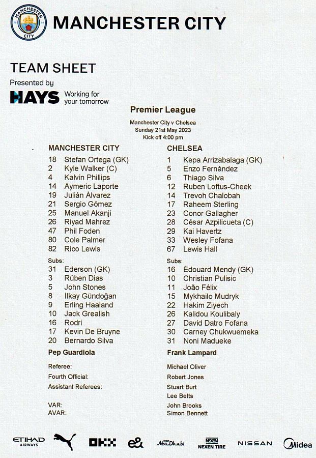 Stefan Ortega, Kyle Walker, Manuel Akanji (John Stones 57), Aymeric Laporte (Rodri 78), Sergio Gomez (Kevin De Bruyne 78), Rico Lewis, Kalvin Phillips, Cole Palmer, Riyad Mahrez (Erling Haaland 73), Phil Foden, Julian Alvarez |