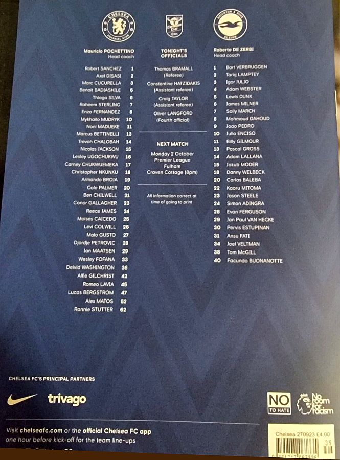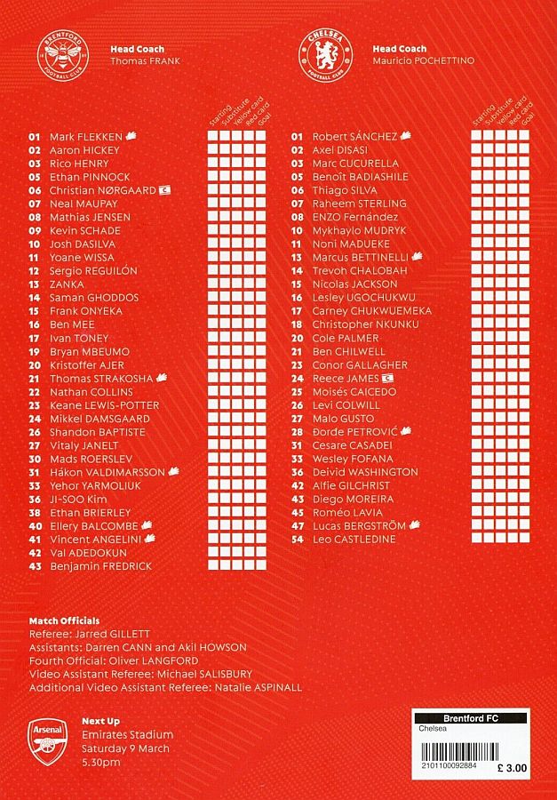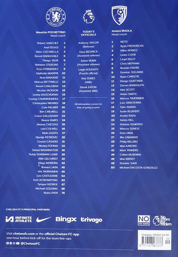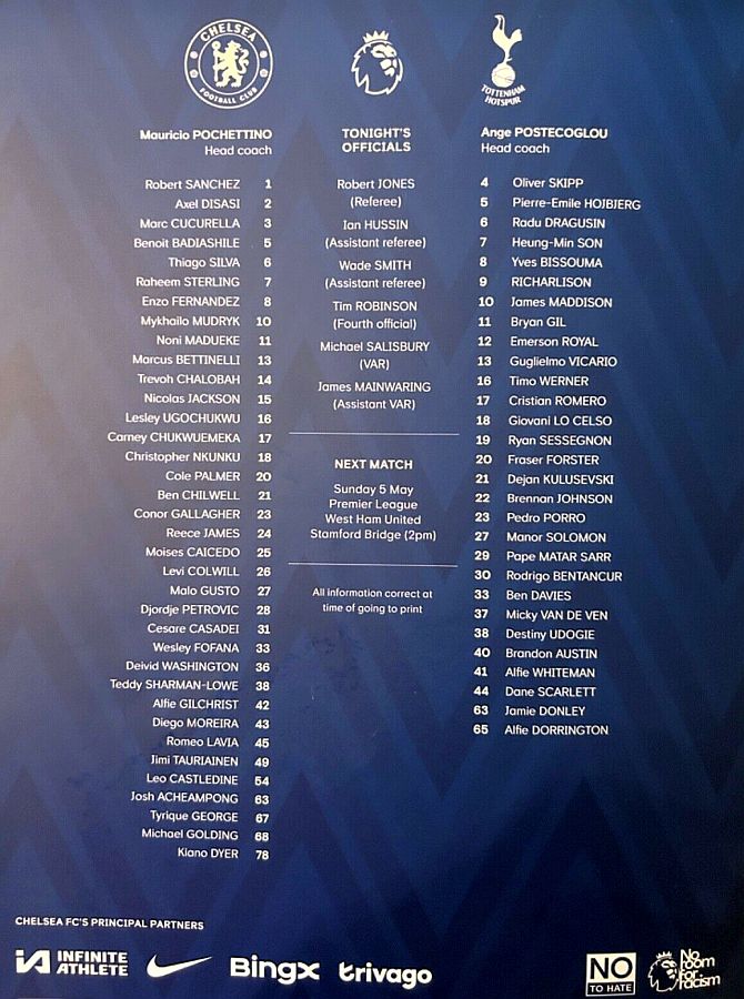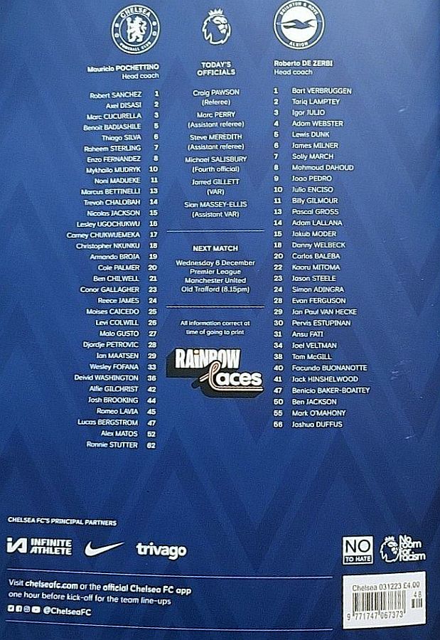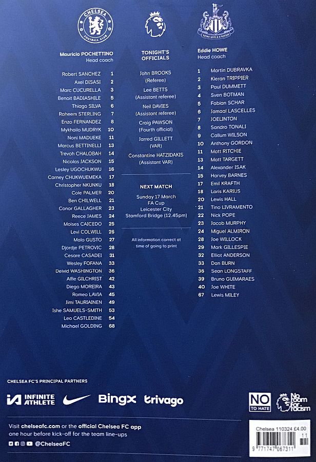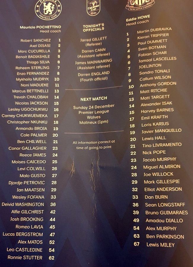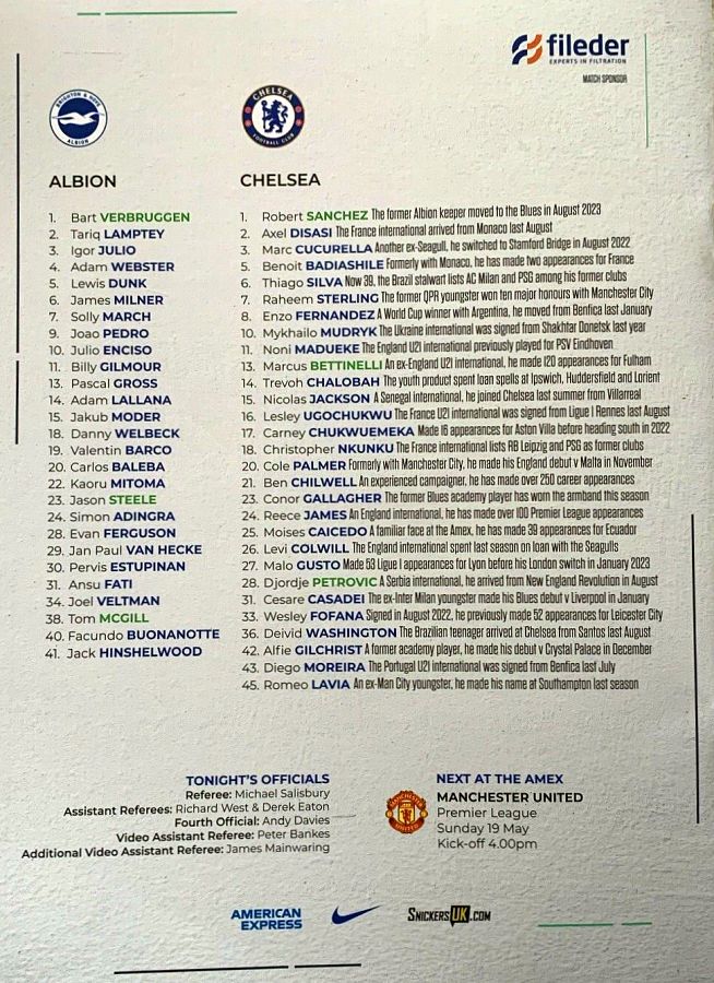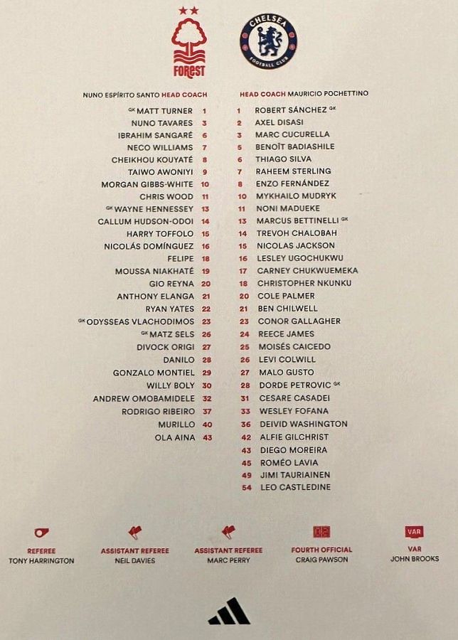 28 Djordje Petrovic, 3 Marc Cucurella, 5 Benoit Badiashile, 6 Thiago Silva ( 2 Axel Disasi 90), 10 Mykhailo Mudryk (31 Cesare Casadei 90), 11 Noni Madueke, 14 Trevoh Chalobah, 15 Nicolas Jackson, 20 Cole Palmer, 23 Conor Gallagher, 25 Moises Caicedo |