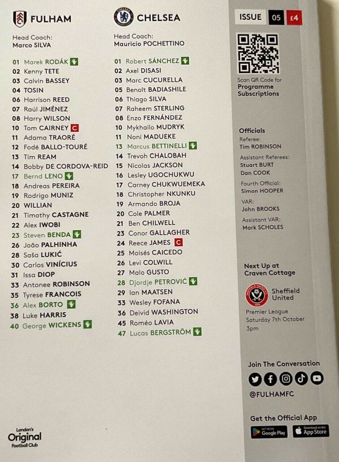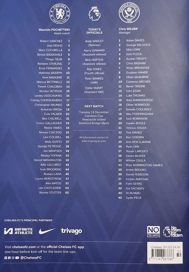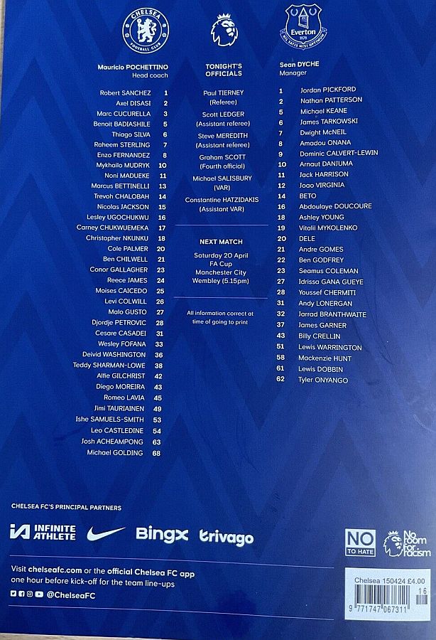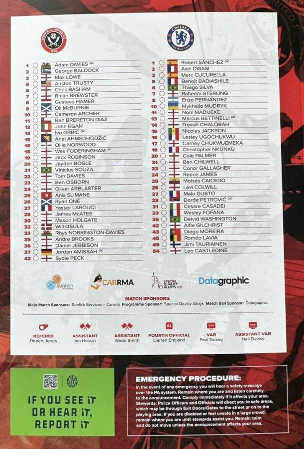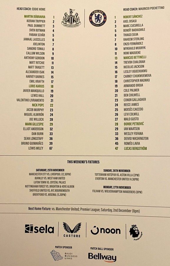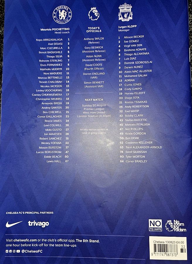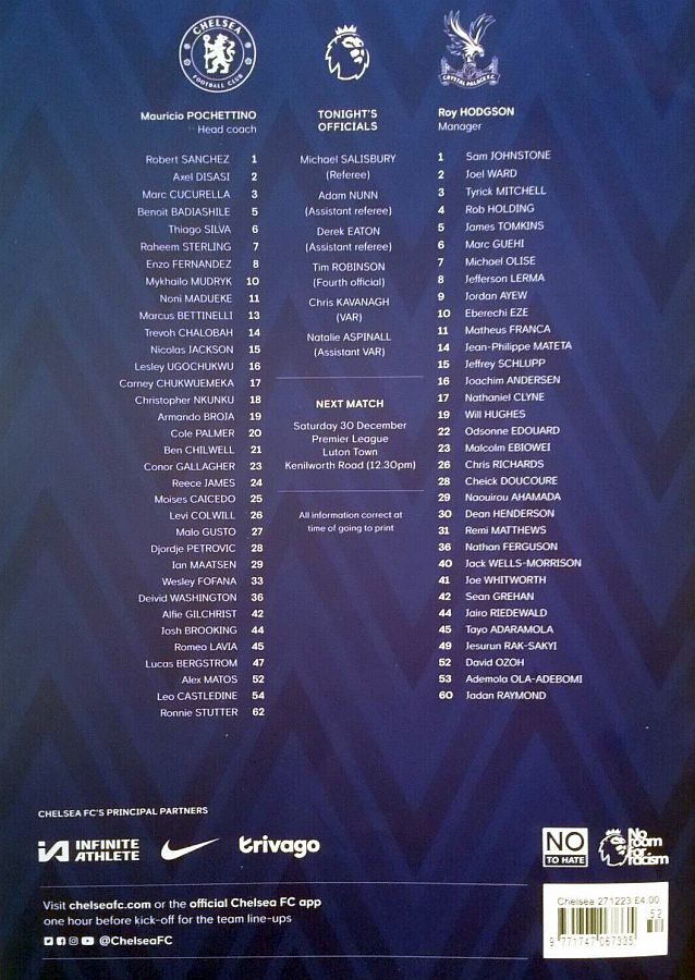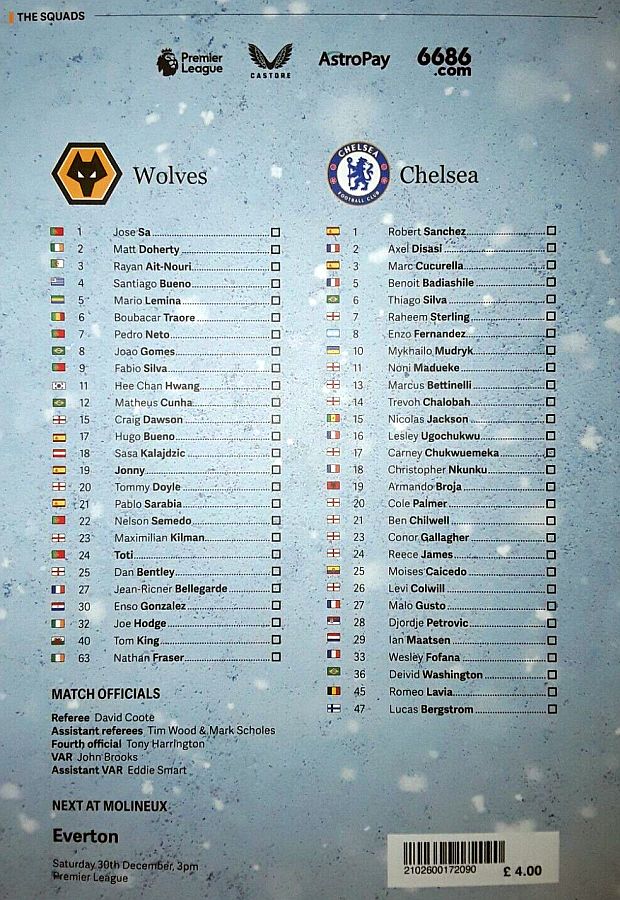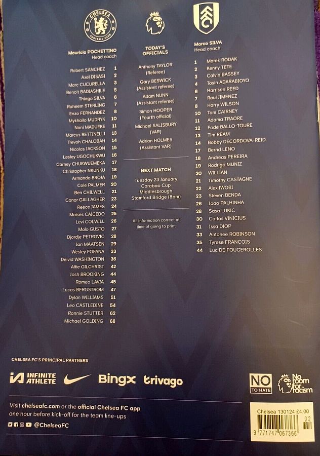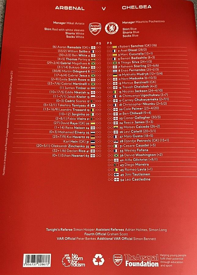 28 Djordje Petrovic, 3 Marc Cucurella, 5 Benoit Badiashile, 6 Thiago Silva ( 2 Axel Disasi 90), 10 Mykhailo Mudryk (31 Cesare Casadei 90), 11 Noni Madueke, 14 Trevoh Chalobah, 15 Nicolas Jackson, 20 Cole Palmer, 23 Conor Gallagher, 25 Moises Caicedo |