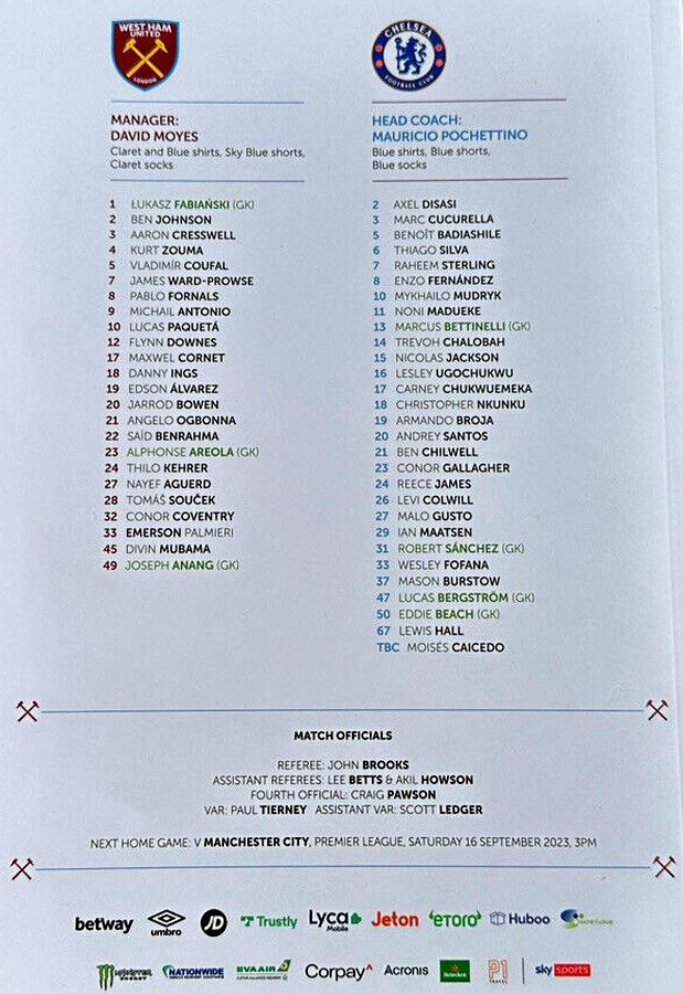 Alphonse Areola, Vladimir Coufal, Kurt Zouma, Nayef Aguerd, Emerson, Thomas Soucek, Lucas Paqueta, Jarrod Bowen, James Ward-Prowse (Edson Alvarez 81), Said Benrahma, Michail Antonio (Pablo Fornals 76) |