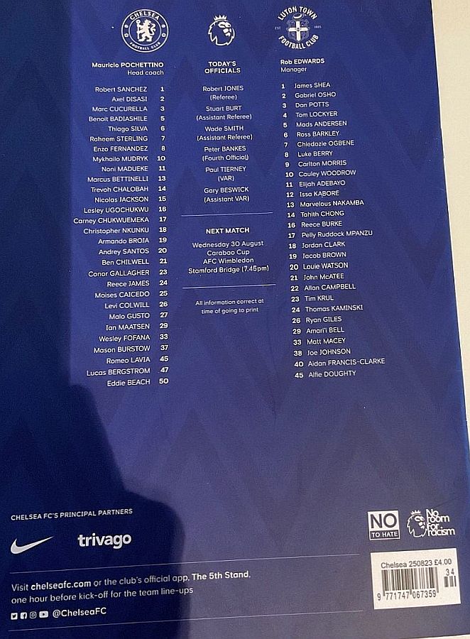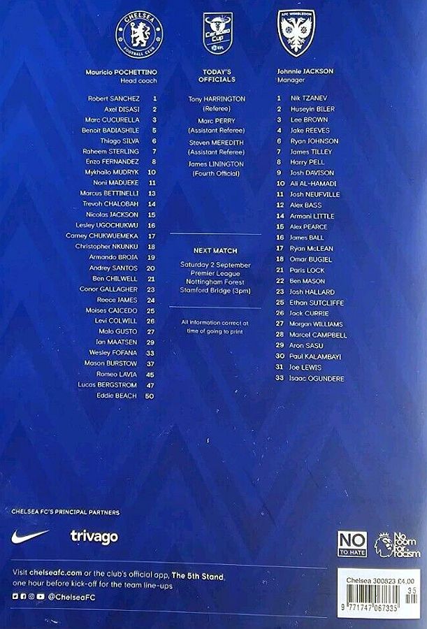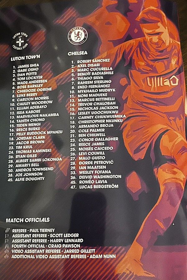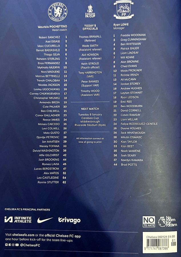 1 Robert Sanchez, 2 Axel Disasi, 6 Thiago Silva, 7 Raheem Sterling (37 Mason Burstow 90), 8 Enzo Fernandez, 15 Nicolas Jackson (16 Lesley Ugochukwu 83), 21 Ben Chilwell (29 Ian Maatsen 86), 23 Conor Gallagher, 25 Moises Caicedo, 26 Levi Colwill, 27 Malo Gusto |