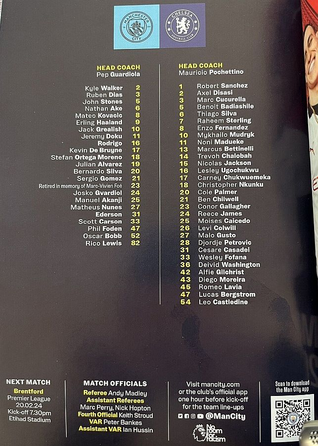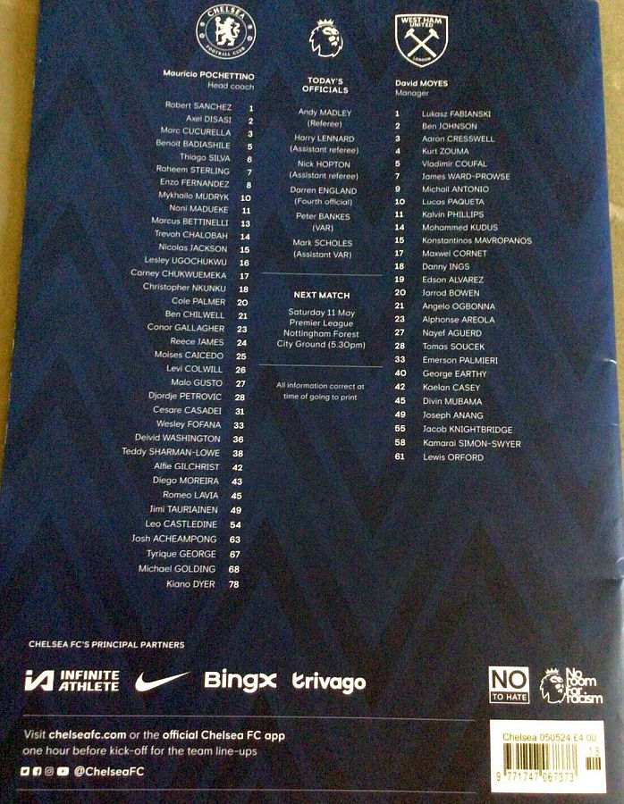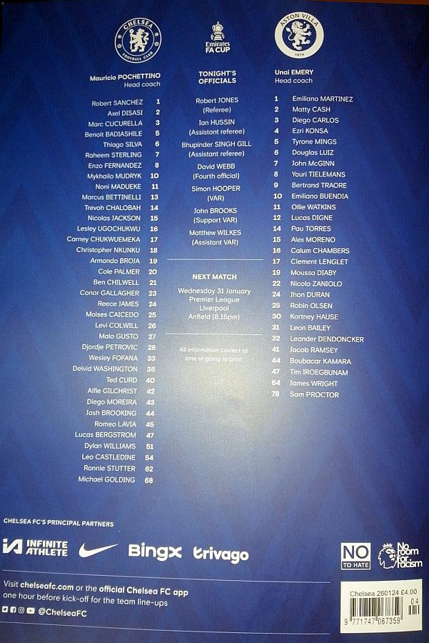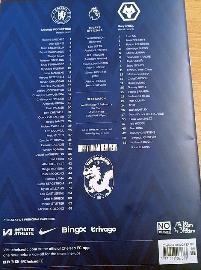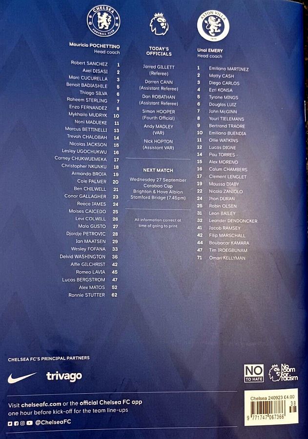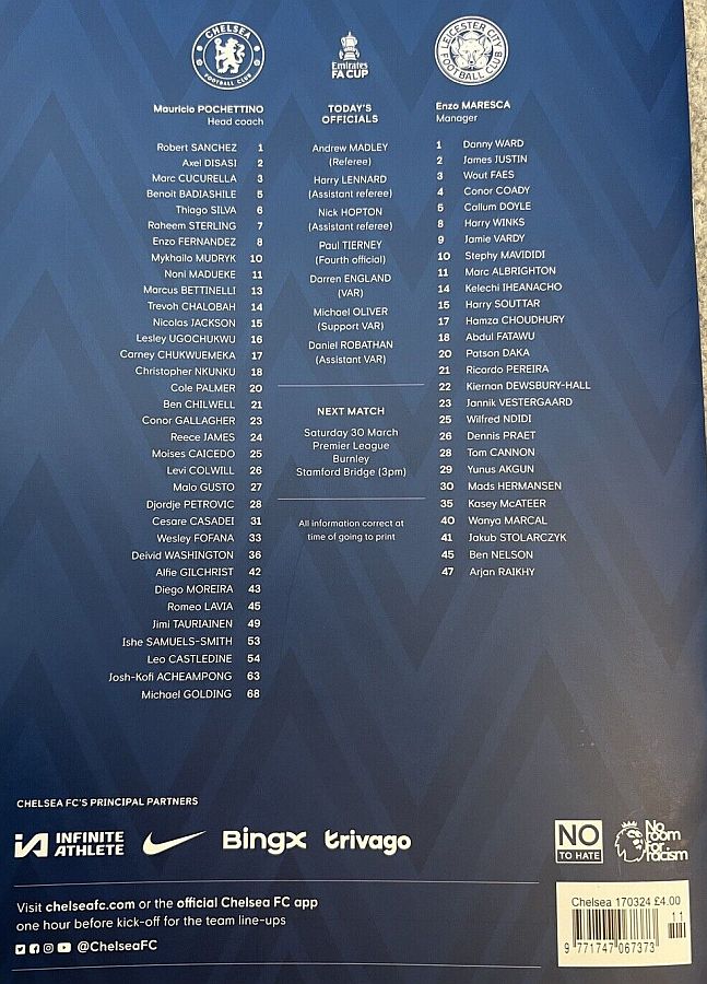1 Robert Sanchez, 2 Axel Disasi, 6 Thiago Silva, 7 Raheem Sterling, 8 Enzo Fernandez, 15 Nicolas Jackson, 21 Ben Chilwell (11 Noni Madueke 62), 23 Conor Gallagher (20 Cole Palmer 62), 25 Moises Caicedo (29 Ian Maatsen 77), 26 Levi Colwill, 27 Malo Gusto (10 Mykhailo Mudryk 77) |
