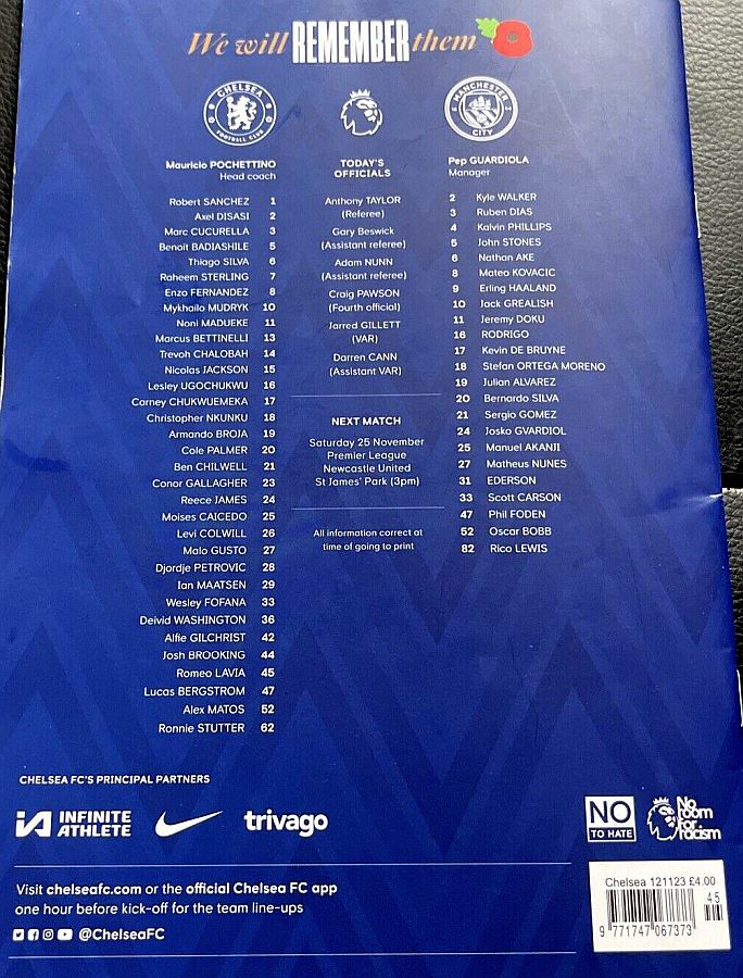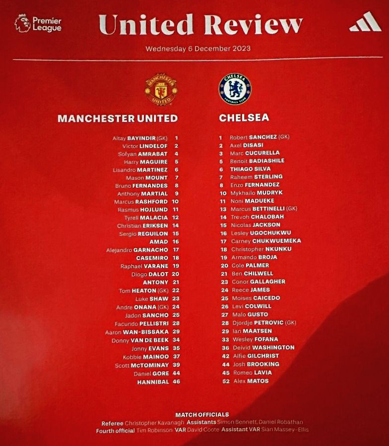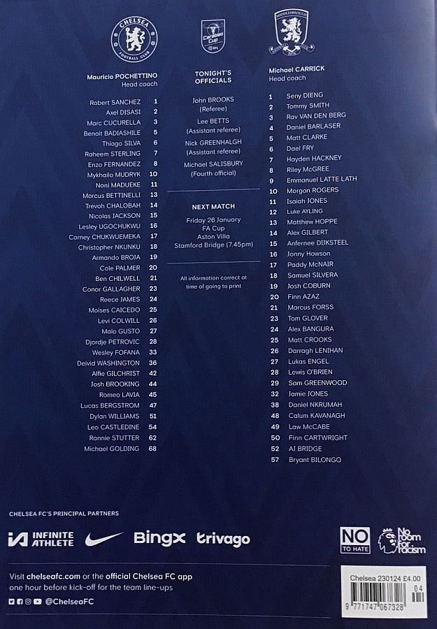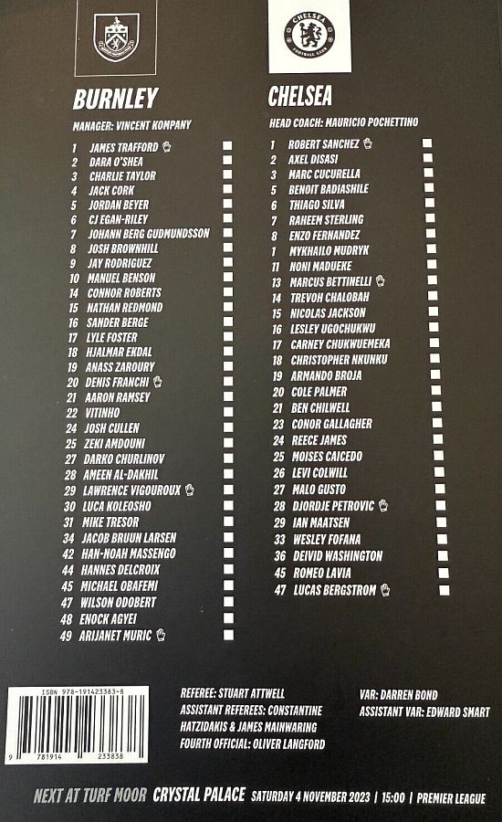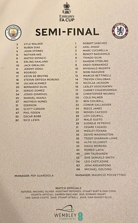 31 Robert Sanchez, 2 Axel Disasi, 6 Thiago Silva, 7 Raheem Sterling (10 Mykhailo Mudryk 81), 8 Enzo Fernandez, 15 Nicolas Jackson, 17 Carney Chukwuemeka (29 Ian Maatsen 81), 21 Ben Chilwell (16 Lesley Ugochukwu 90), 23 Conor Gallagher, 24 Reece James (27 Malo Gusto 76), 26 Levi Colwill |