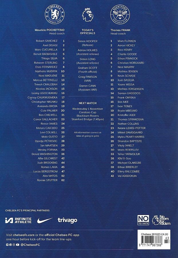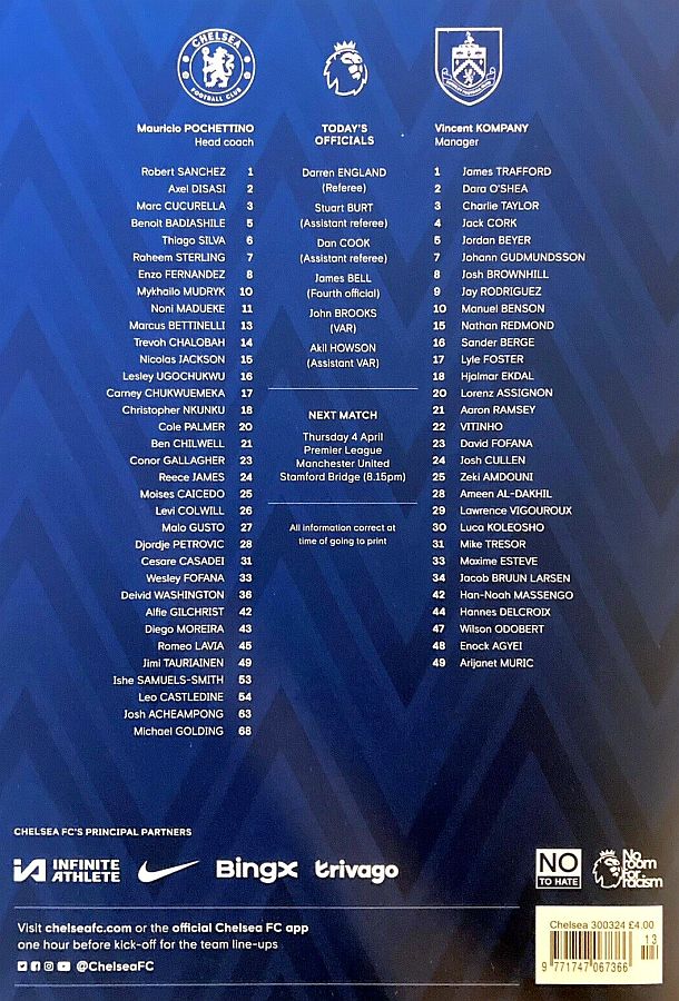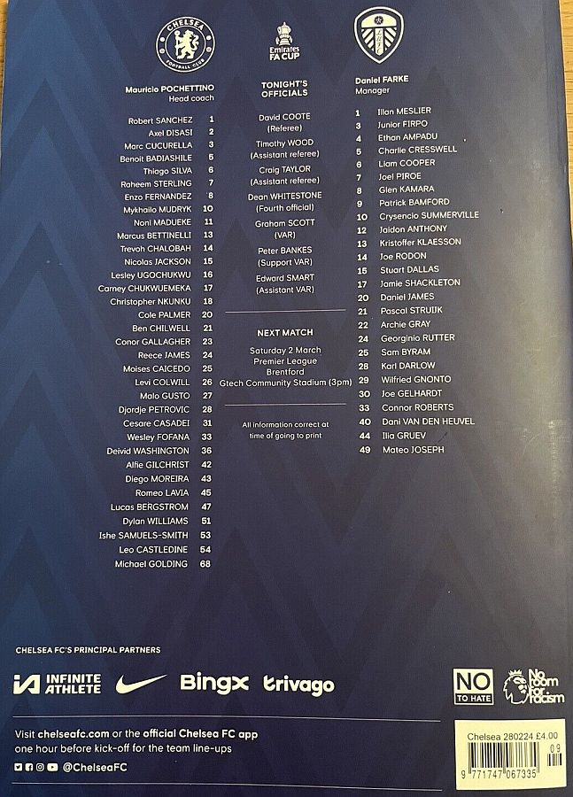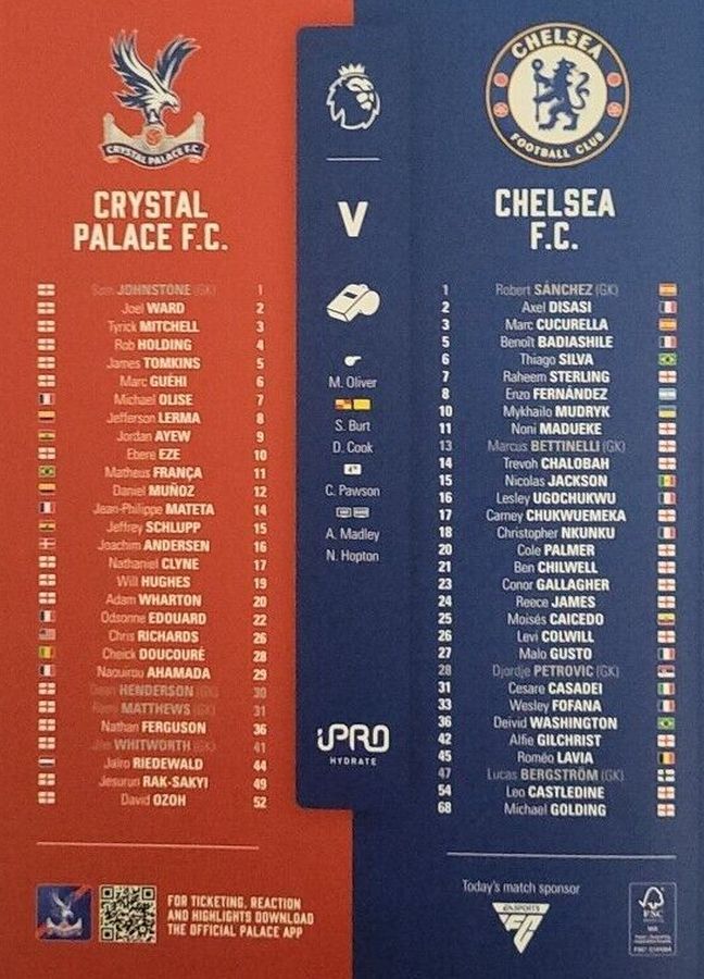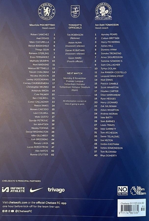 1 Robert Sanchez, 2 Axel Disasi, 3 Marc Cucurella, 11 Noni Madueke (25 Moises Caicedo 81), 16 Lesley Ugochukwu, 23 Conor Gallagher, 26 Levi Colwill (27 Malo Gusto 65), 29 Ian Maatsen, 37 Mason Burstow ( 8 Enzo Fernandez 65), 43 Diego Moreira (15 Nicolas Jackson 46), 48 Bashir Humphreys |