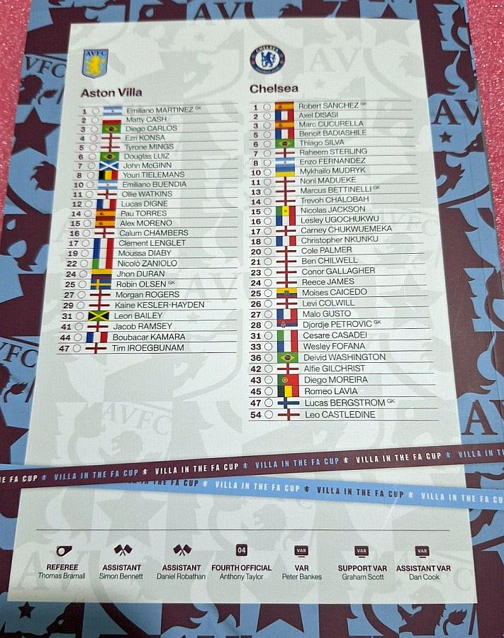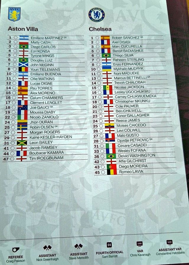 Emiliano Martinez (Robin Olsen 46), Matty Cash, Ezri Konsa, Pau Torres, Lucas Digne, John McGinn, Youri Tielemans (Moussa Diaby 27) (Jhon Duran 83), Leon Bailey (Diego Carlos 75), Douglas Luiz (Tim Iroegbunam 75), Morgan Rogers, Ollie Watkins |