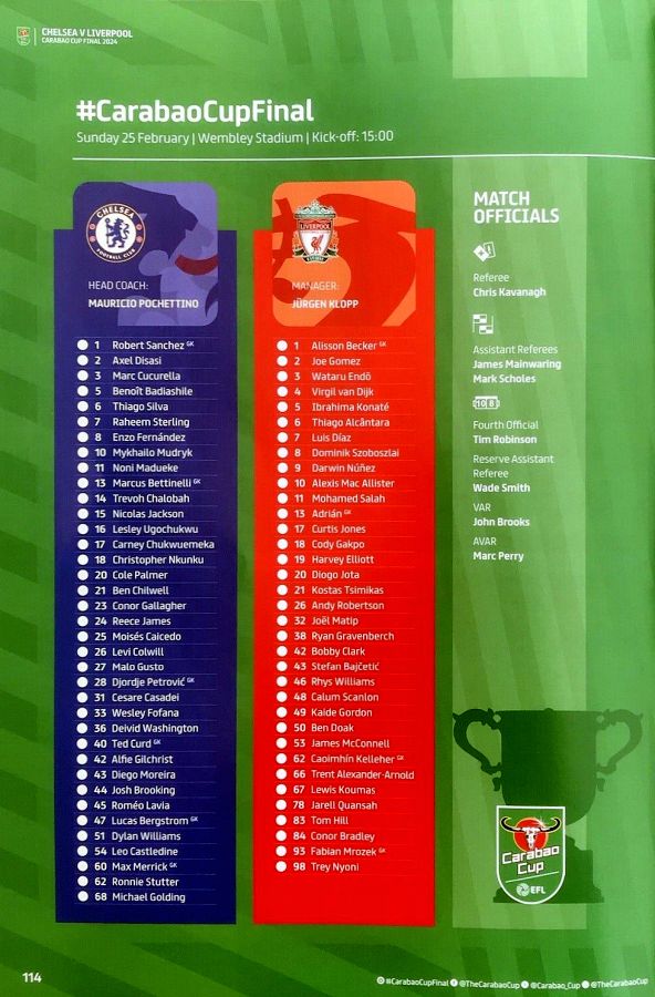 28 Djordje Petrovic, 3 Marc Cucurella, 5 Benoit Badiashile, 6 Thiago Silva ( 2 Axel Disasi 82), 10 Mykhailo Mudryk (18 Chris Nkunku 77), 11 Noni Madueke (31 Cesare Casadei 76), 14 Trevoh Chalobah (27 Malo Gusto 83), 15 Nicolas Jackson, 20 Cole Palmer (42 Alfie Gilchrist 89), 23 Conor Gallagher, 25 Moises Caicedo |