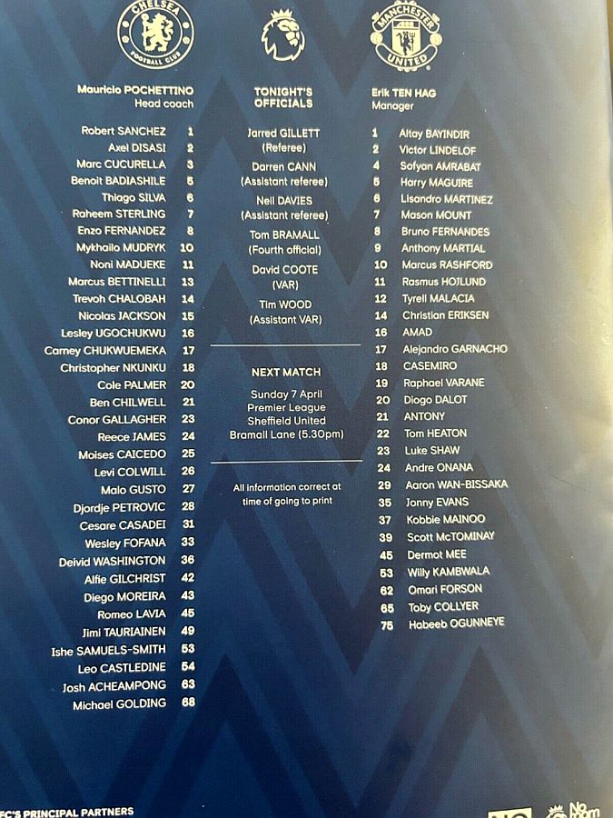1 Robert Sanchez, 2 Axel Disasi, 6 Thiago Silva, 7 Raheem Sterling, 8 Enzo Fernandez, 15 Nicolas Jackson, 17 Carney Chukwuemeka (10 Mykhailo Mudryk 46), 21 Ben Chilwell (25 Moises Caicedo 61), 23 Conor Gallagher (11 Noni Madueke 75), 26 Levi Colwill, 27 Malo Gusto (37 Mason Burstow 83) |