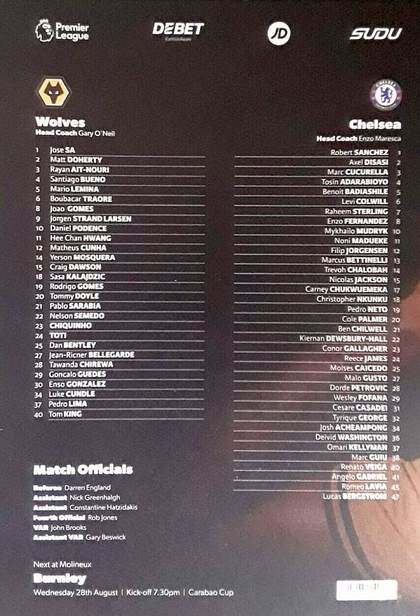 Jose Sa, Matt Doherty, Yerson Mosquera, Toti, Rayan Ait-Nouri (Craig Dawson 68), Joao Gomes, Mario Lemina (Tommy Doyle 90), Hwang (Daniel Podence 59), Jean-Ricner Bellegarde (Rodrigo Gomes 68), Matheus Cunha (Pablo Sarabia 68), Jorgen Strand Larsen |