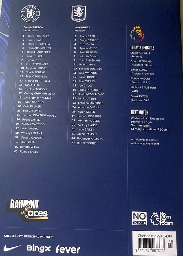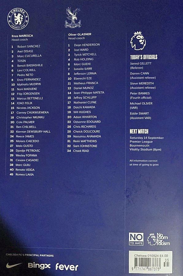 39 Mike Penders, 11 Noni Madueke, 14 Dario Essugo, 17 Andrey Santos, 19 Mamadou Sarr, 32 Tyrique George, 34 Josh Acheampong, 38 Marc Guiu, 44 Gaga Slonina |