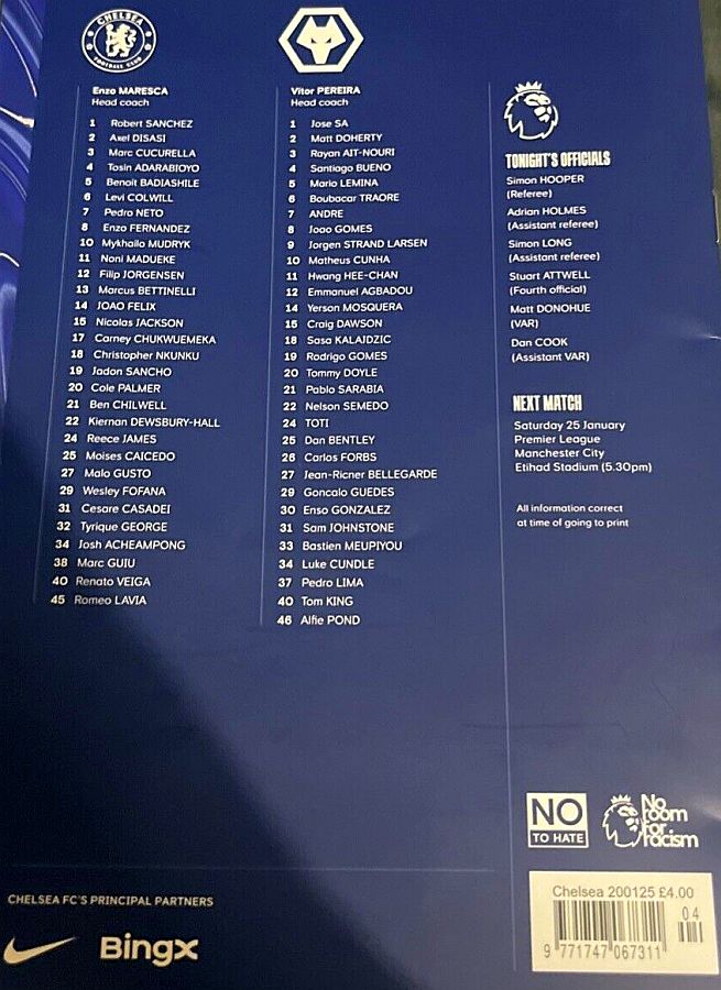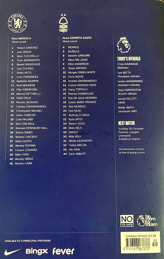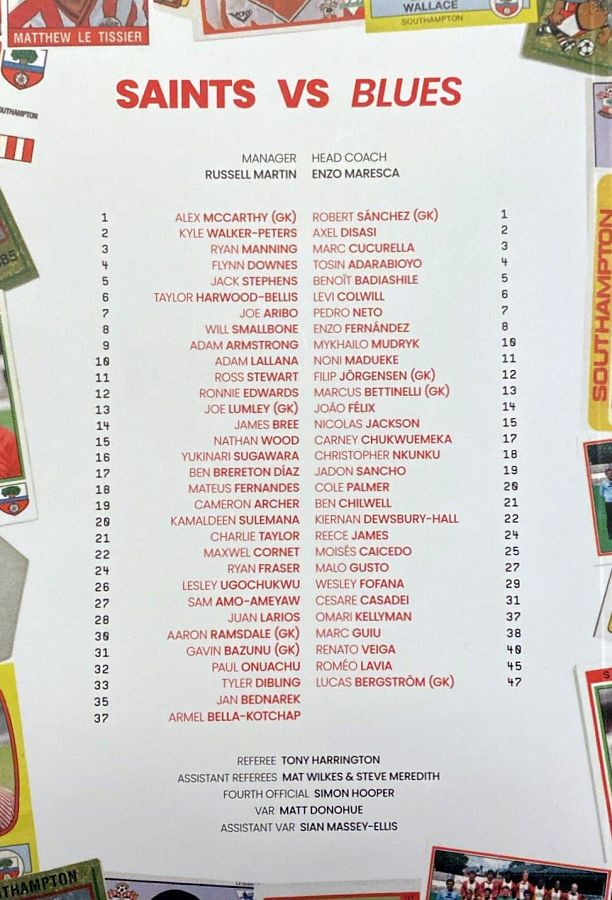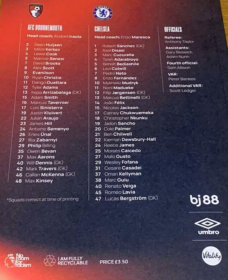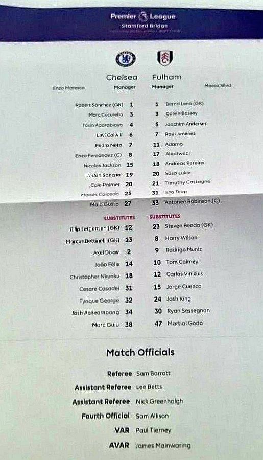 1 Robert Sanchez, 3 Marc Cucurella, 6 Levi Colwill, 7 Pedro Neto (14 Joao Felix 58), 8 Enzo Fernandez, 11 Noni Madueke (18 Chris Nkunku 86), 15 Nicolas Jackson, 20 Cole Palmer, 25 Moises Caicedo, 27 Malo Gusto (10 Mykhailo Mudryk 73), 29 Wesley Fofana |