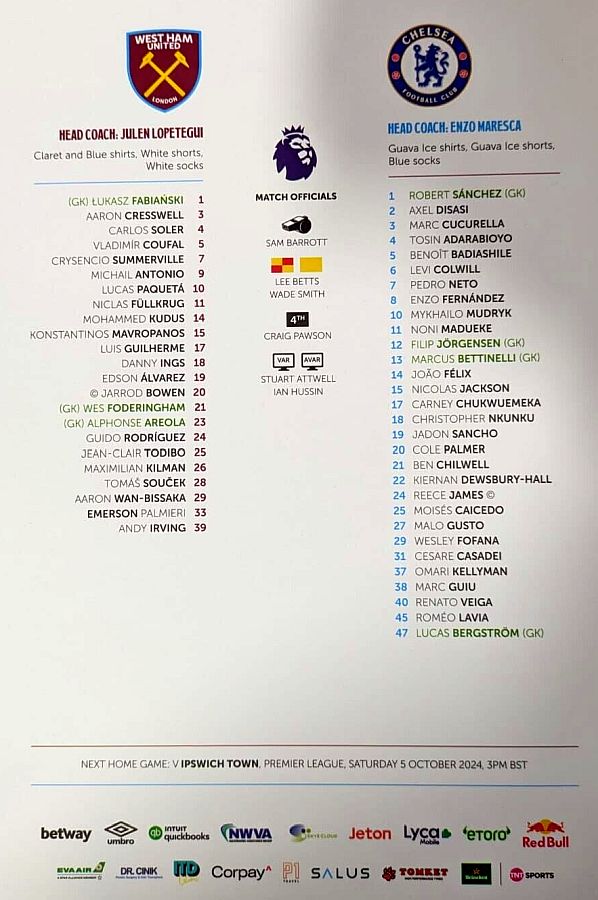 1 Robert Sanchez, 3 Marc Cucurella, 6 Levi Colwill, 7 Pedro Neto (18 Chris Nkunku 78), 8 Enzo Fernandez (17 Andrey Santos 61), 10 Cole Palmer, 23 Trevoh Chalobah, 24 Reece James (22 Kiernan Dewsbury-Hall 77), 25 Moises Caicedo, 27 Malo Gusto, 20 Joao Pedro ( 9 Liam Delap 67) |