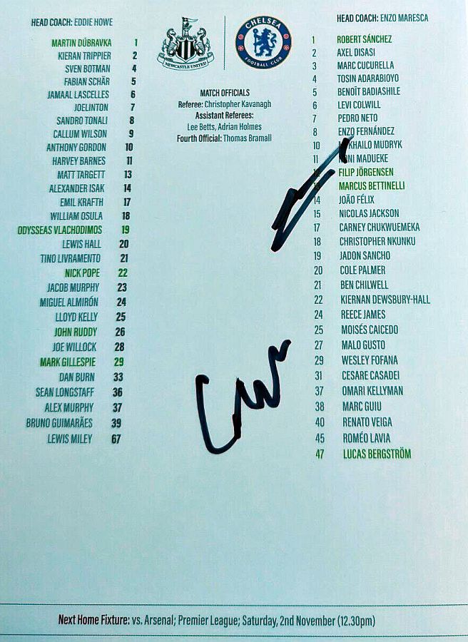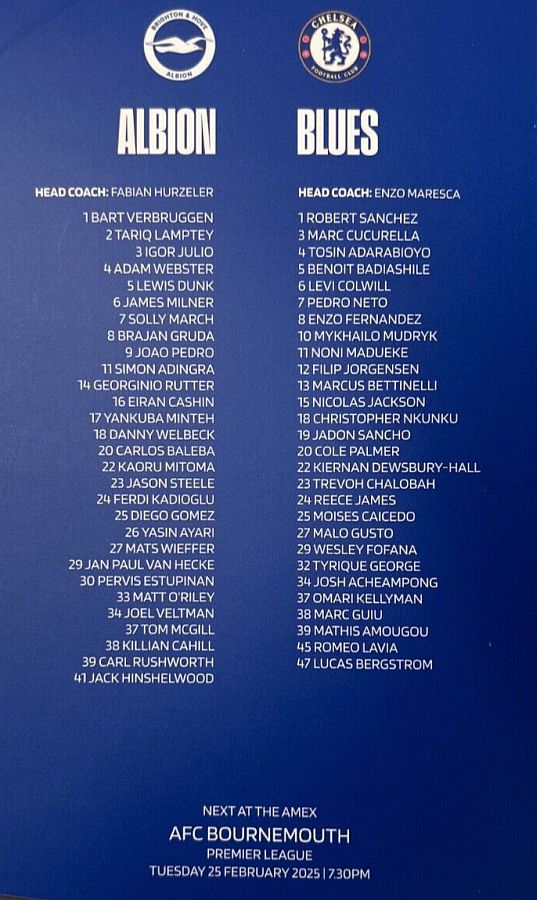 1 Robert Sanchez, 39 Mike Penders, 3 Marc Cucurella, 6 Levi Colwill, 7 Pedro Neto, 10 Cole Palmer, 23 Trevoh Chalobah, 24 Reece James, 25 Moises Caicedo, 30 Aaron Anselmino |