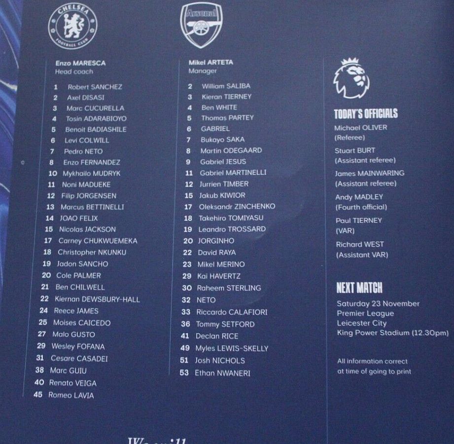 12 Filip Jorgensen, 2 Axel Disasi (27 Malo Gusto 78), 4 Tosin Adarabioyo, 5 Benoit Badiashile, 7 Pedro Neto (11 Noni Madueke 57), 10 Mykhailo Mudryk, 18 Chris Nkunku ( 8 Enzo Fernandez 57), 22 Kiernan Dewsbury-Hall, 25 Moises Caicedo (45 Romeo Lavia 87), 38 Marc Guiu (20 Cole Palmer 57), 40 Renato Veiga |