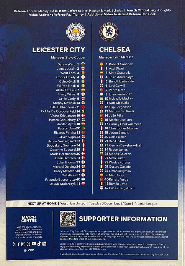 1 Robert Sanchez, 3 Marc Cucurella, 6 Levi Colwill, 7 Pedro Neto, 8 Enzo Fernandez (11 Noni Madueke 82), 9 Liam Delap (15 Nicolas Jackson 64), 10 Cole Palmer (38 Marc Guiu 82), 23 Trevoh Chalobah, 24 Reece James (45 Romeo Lavia 64), 25 Moises Caicedo, 27 Malo Gusto |