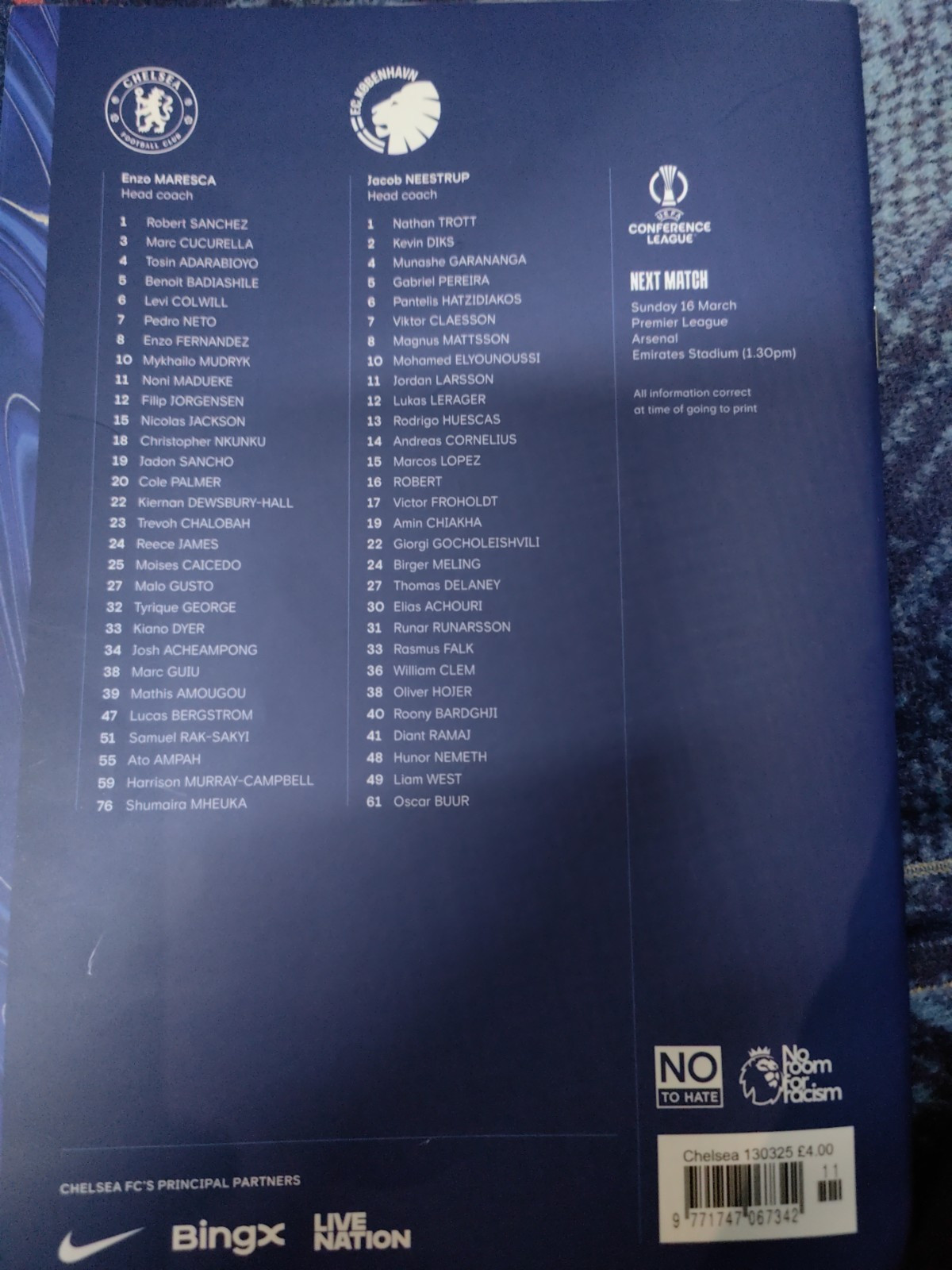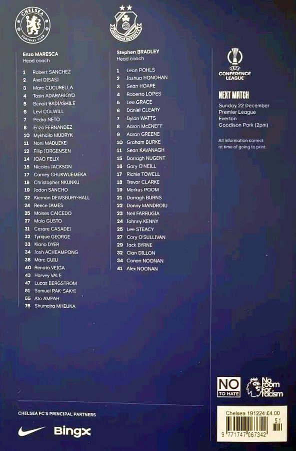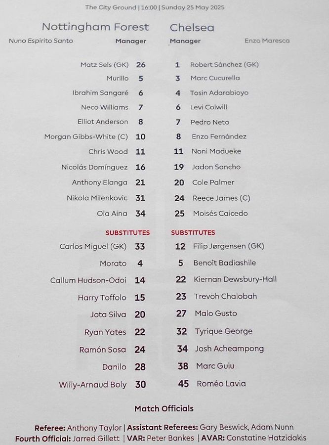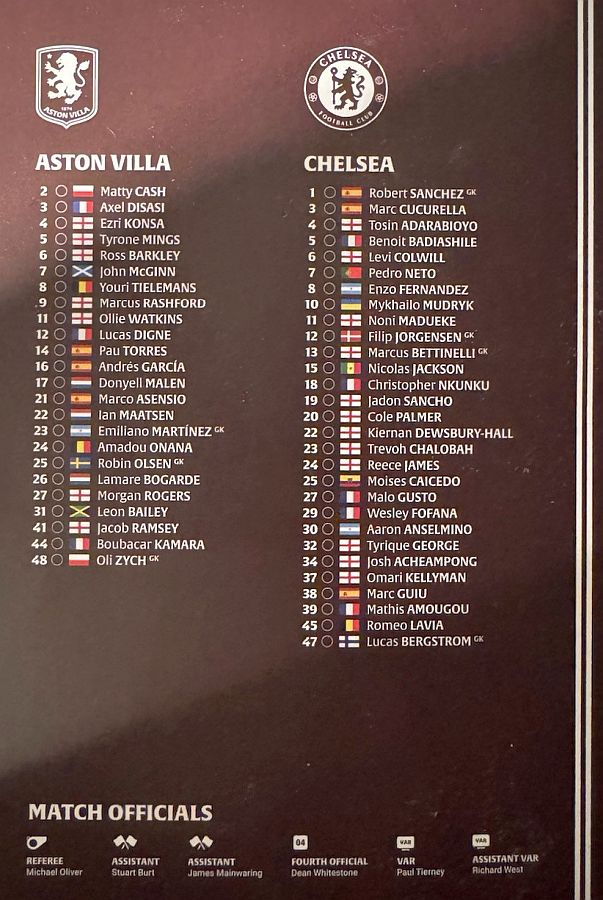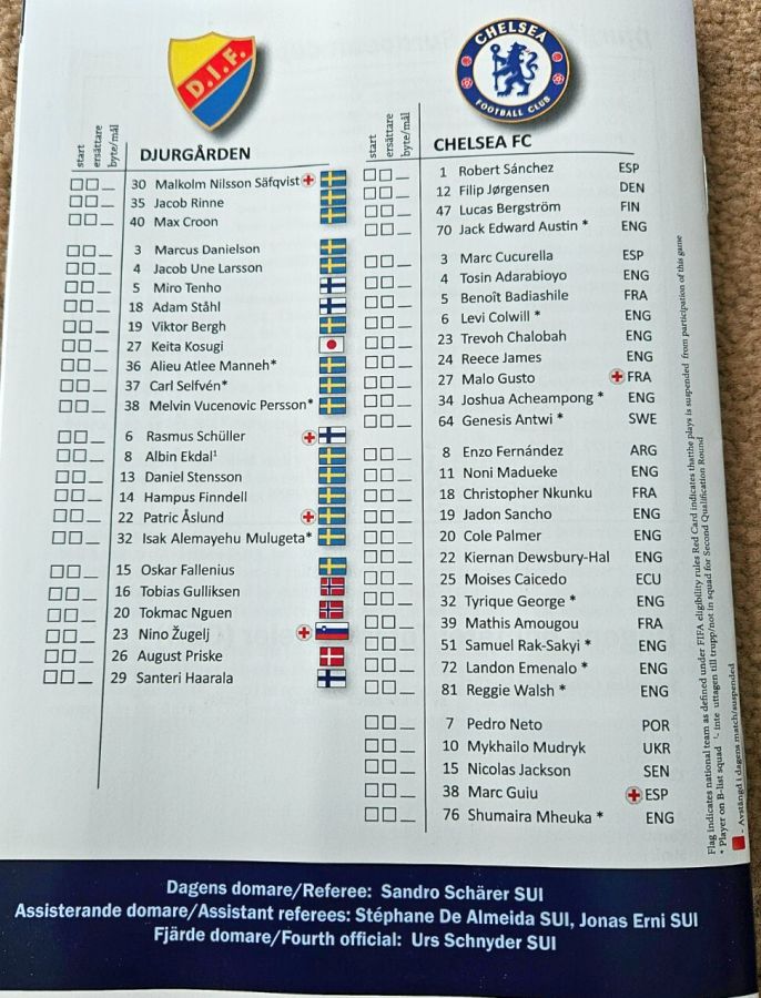 12 Filip Jorgensen, 4 Tosin Adarabioyo, 5 Benoit Badiashile, 8 Enzo Fernandez (17 Andrey Santos 68), 9 Liam Delap (38 Marc Guiu 59), 11 Noni Madueke (32 Tyrique George 68), 18 Chris Nkunku, 22 Kiernan Dewsbury-Hall, 27 Malo Gusto (19 Mamadou Sarr 82), 34 Josh Acheampong, 45 Romeo Lavia (14 Dario Essugo 59) |