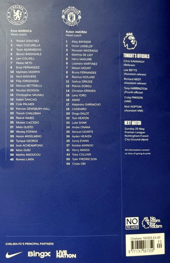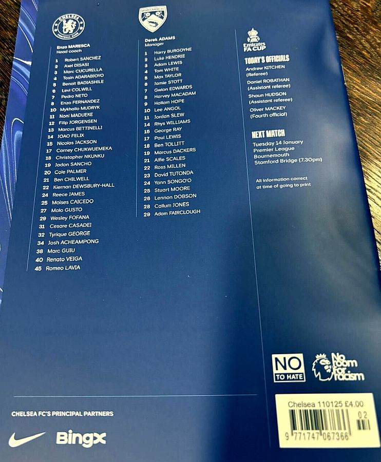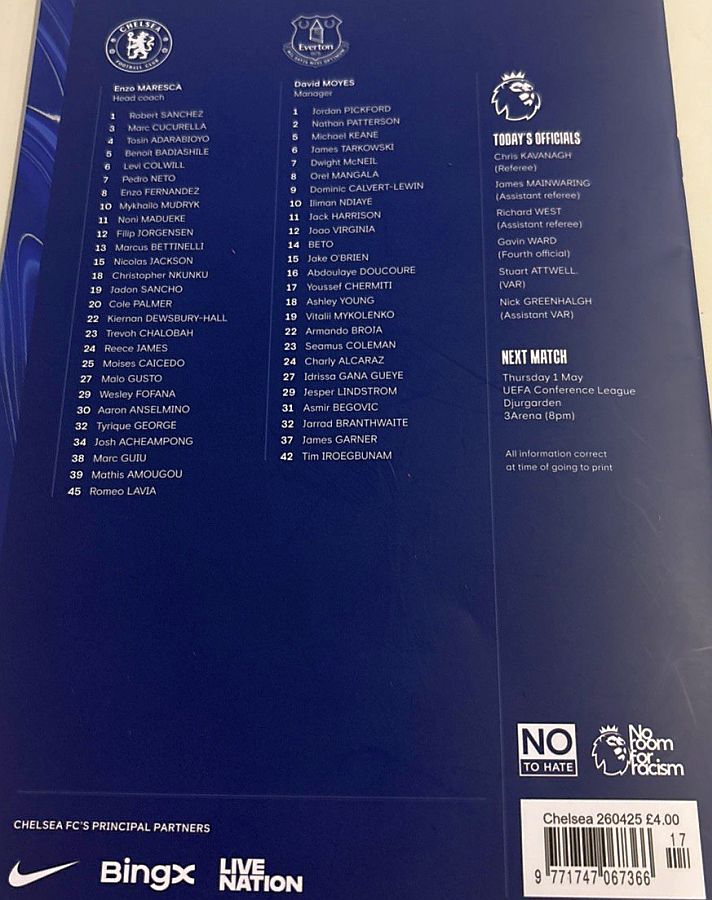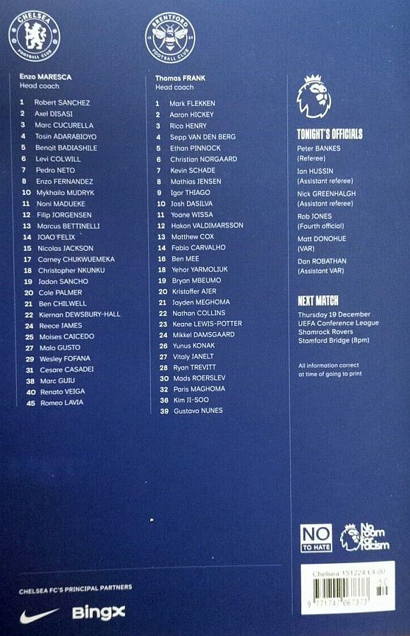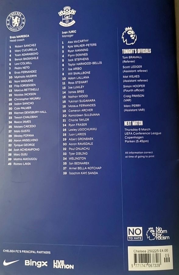 12 Filip Jorgensen, 4 Tosin Adarabioyo, 5 Benoit Badiashile, 8 Enzo Fernandez (17 Andrey Santos 68), 9 Liam Delap (38 Marc Guiu 59), 11 Noni Madueke (32 Tyrique George 68), 18 Chris Nkunku, 22 Kiernan Dewsbury-Hall, 27 Malo Gusto (19 Mamadou Sarr 82), 34 Josh Acheampong, 45 Romeo Lavia (14 Dario Essugo 59) |