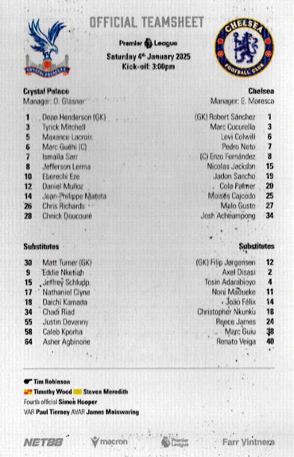 Dean Henderson, Daniel Munoz, Chris Richards, Nathaniel Clyne, Marc Guehi, Tyrick Mitchell, Adam Wharton, Will Hughes (Cheick Doucoure 50), Daichi Kamada (Jeffrey Schlupp 88), Ebere Eze, Jean-Phillippe Mateta (Ismaila Sarr 69) |
