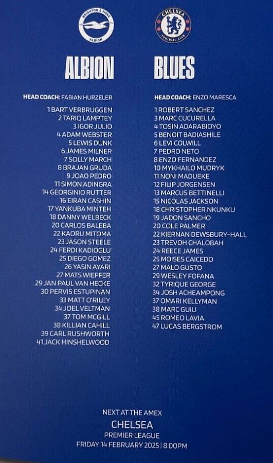 1 Robert Sanchez, 13 Marcus Bettinelli, 34 Josh Acheampong, 6 Levi Colwill, 3 Marc Cucurella |