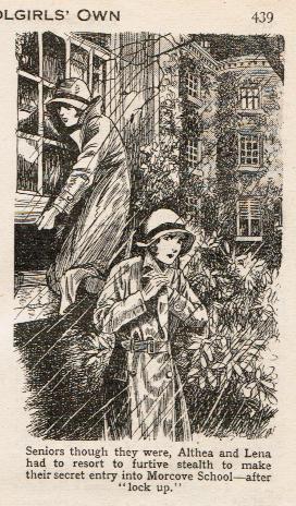 And so she is brought back to Morcove, a heroine, and put into the Sanatorium. She asks for Ethel, who goes to see her - nothing is known of the conversation between the two. Shortly afterwards, Ethel comes to the ‘den’ and quickly relates contacts the printers, retracting Althea’s poem and says that a last moment article will be on its’ way. Betty and Polly are appalled at this retraction until Ethel in not so many words, explains. She then goes on to ask Polly to quickly write an account of Althea’s heroism – in saving the daughter of the skipper of a foreign vessel. Polly does the job and she and Betty ride into Barncombe to deliver the final copy for the printers. Polly is unsure though, that Althea isn’t out of the woods yet as regards her Aunt Kath. Betty to Polly: