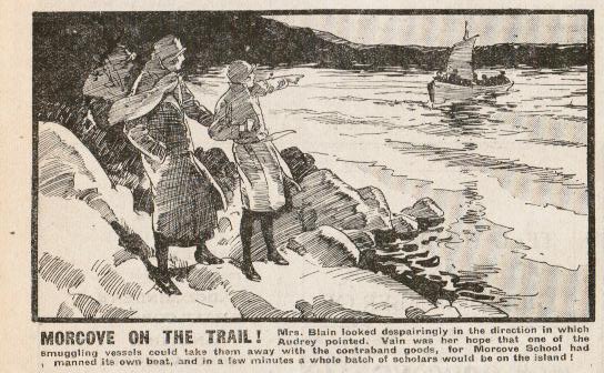 The Study 12 Coterie are on Gull Island for a picnic, and Polly reminisces about previous adventures on Gull Island, and even about Audrey Blain and how despicable she was. Polly also has a bit of her fun, and pretends she is in the midst of a silk smuggling racket operating from Gull Island. If only she had known! The Coterie also realise that they are not alone on the Island, as Polly then sees a woman furtively threading herself through some undergrowth some distance away. Just after this picnic, the girls come back to Morcove, and find there is a new tweenie maid just starting her first day at Morcove, and she introduces herself to them, with the name of Florence Blair, but known as Florrie. (At Stormwood, she was known as Anna Blair). More or less at the same time, Cora is out for a spin on her motor bike and comes across a girl walking along the road towards the Old Grange. Her name is Norma and she explains to Cora that she has been recently adopted by a family named Halden, and that they are living in the Old Grange for the Summer. At this stage Norma is completely in the dark of the Halden's racket, and has no idea at all of Audrey's existence. (It must have been quite easy to adopt a young teenage girl in those days!). The day after Norma comes along to Morcove because Cora left some belongings of hers at the house, and she is introduced to Betty & Co, whom she likes very much. The Study 12 Coterie also take to Norma, and they can see the loneliness that is within the girl. When Norma goes back to the Old Grange, she is bewildered by Mrs Halden's refusal to let her associate with her new made Morcove friends. A few nights after the Gull Island picnic, and Cora's encounter with Norma, Cora breaks down with her motor bike, and the girls are asked via Florrie that they are to help search for Cora.