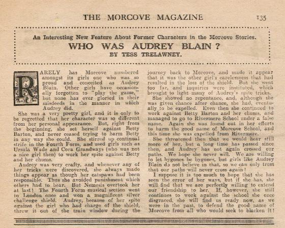 Your Editor’s Chat in SO 70 gives a glimpse of what Audrey Blain has in store for Morcove: But now a new element of discord in the person of Audrey Blain has appeared at the old school. You will remember that I said in speaking of her last week, that she was more dangerous than Cora because she was more subtle…..