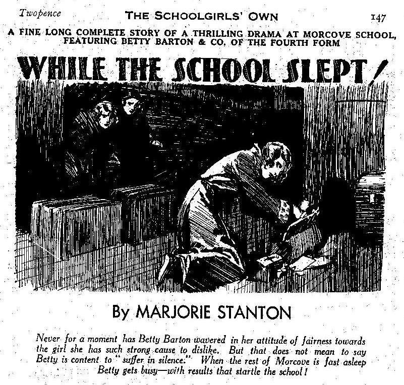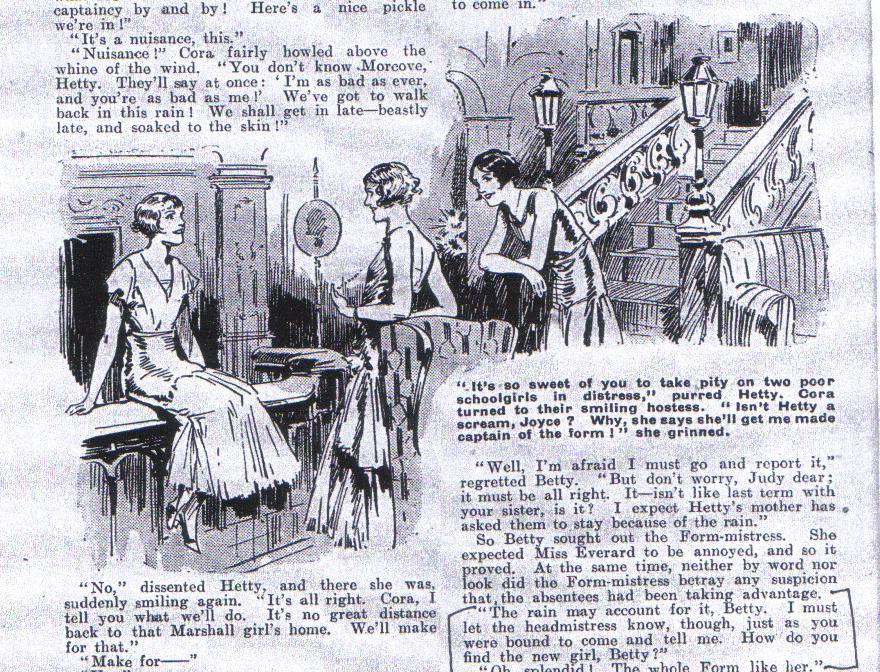 Hetty is still at Morcove, Miss Somerfield having decided to keep her on. Cora was not allowed back after the folding of Fallowfield. Hazel Baynard is a new girl at Morcove, and shares a study with Pat Lawrence. Hazel, a very complex girl although she has a common touch about her. Hazel is friendly with Joyce Marshall of Gorselands, having met her previously at an Hotel in Brighton. Joyce casually asks after Hetty, as she hasn’t heard from her in a while - there also seems to have been a falling out between Hetty and Joyce. Hazel realises that making a friend of Hetty may to her advantage, but Hetty doesn’t seem to want anything to do with her. Ridgeworth Baynard has just become rich due to a sharemarket fraud, and amongst his victims is Betty’s Father, Mr Barton. This fact comes about when Betty’s Mother comes to Morcove the day after new term to tell Betty the bad news, and this visit co-incides with Mrs Baynard bringing Hazel to school. The two women meet, and Mrs Barton snubs Mrs Baynard, rousing Betty’s suspicions. A day or so later, Polly comes across a newspaper clipping regarding this fraud, naming Baynard as the perpetrator. Mrs Baynard herself is quite genuine and lives in constant dread of her husband’s dealings. One evening whilst Baynard is secretly visiting Hazel, he hands over a huge amount of money in a suitcase and confesses that he is guilty. Hazel soon secrets the money away, on the moor, about a quarter of a mile from Morcove. Betty’s family take a small cottage in Sandton Bay for the duration. A few days later there is another report in the paper absolving Ridgeworth, and naming his secretary as the perpetrator of the fraud. Meanwhile Hazel, being short of funds, decides to raid the money hidden on the moor, and on her way back to Morcove comes across Laura Dorland, who introduces herself as her Father’s secretary, and says that he is guilty. . Laura is desperate for even more money, so she springs upon Hazel and takes the money, also threatening Hazel that she will be back. More or less at the same time, Hetty has come across the rest of the hidden money on the moor and takes it. Seeing a way to ingratiate herself with the Morcove girls, Hazel decides to create a fund to aid the victims of the fraud and starts the fund with a large donation. Hetty also offers a large donation and starts spending money freely, which creates suspicion amongst the girls. Hazel slowly sinks deeper and deeper, into the mire and she soon and she owes money here, there and everywhere. She resorts to paying her bills with the funds collected from her aid fund. The girls are anxious to get this fund off the ground, so they are on Hazel’s back to finalise the collection and get it sent off to London. When the receipt for the donation doesn’t come, and their name isn’t in the paper, suspicion is also aroused against Hazel. One can almost feel the tension as the story is read, and slowly the net closes around Hazel, who is again harassed by Laura, who has come to live in disguise as Jessica at Sandton Bay. Hetty, temporarily is enjoying her new found status with the illicit funds which Hazel knows about but cannot do anything regarding the situation. Here, Betty’s superb leadership skills and outstanding compassion are shown as she tries to help Hazel, although she knows Hazel is guilty of misappropriating the Morcove fund. Ridgeworth Baynard goes on an extended voyage, and a reward of £1000 is offered by the Police for any information on the absconded secretary. After a visit to Sandton Bay, Betty’s sister Doris is almost run over by an out of control car which Laura, disguised as Jessica Newton is driving. Betty recognises ‘Jessica’ and goes to the Headmistress with this information.