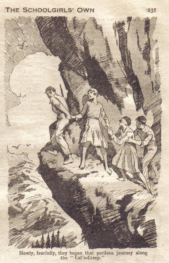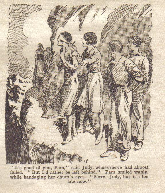 Judy and Cora – on the run from Morcove, were in the vicinity of the old wooden watch tower that was frequently used by the girls of Morcove for sheltering in (Although Leonard Shields in his illustration shows construction of stone). Paula and the Coterie were on a picnic, and Paula had left her contribution back at school. So she went back and got it, and on her way back to the picnic, a storm came. She sheltered in the watch tower, and of course it was struck by lightning! She called out for help. Judy heard the cry: