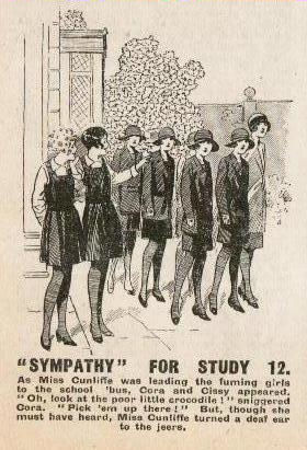Miss Cunliffe reigns the ‘detachment’ at Modena with a vicious intent, whilst her hypocrisy is uppermost at Morcove, with the rest of the Fourth, Miss Somerfield and even Miss Redgrave. The ‘detachment’ – away from the eyes of Miss Somerfield, come in for a reign of terror - stealthily swooping on them when they least expect it; twisting innocent situations out of all proportion; handing out punishments and enforcing strict discipline on them, including forcing them to walk crocodile style. She knows that they won’t complain to the higher authority. Cora and Cissy receive blatantly preferential treatment behind Miss Somerfield’s back. Cora, dancing as high as the stars, ill treats Judy.