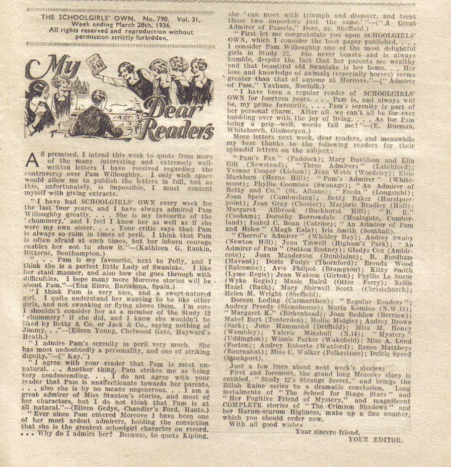 It was also obvious that Pam was also the favourite character of many readers of The Schoolgirls’ Own. Many sign their letters as ‘Pam’, and although we don’t know the actual content of the letters, the Editors replies are published, with the answers their questions. For example: In SO 718 page 557: My Dear Readers, there is a reply to: “The Four Dundonians” – The reason why no story of Pam has yet appeared in the ‘Schoolgirls’ Own Library” is because Pam was not at Morcove at the time of these early adventures. It is possible that a story of her may be published in the future. Best wishes. And in due course, the stories were published.