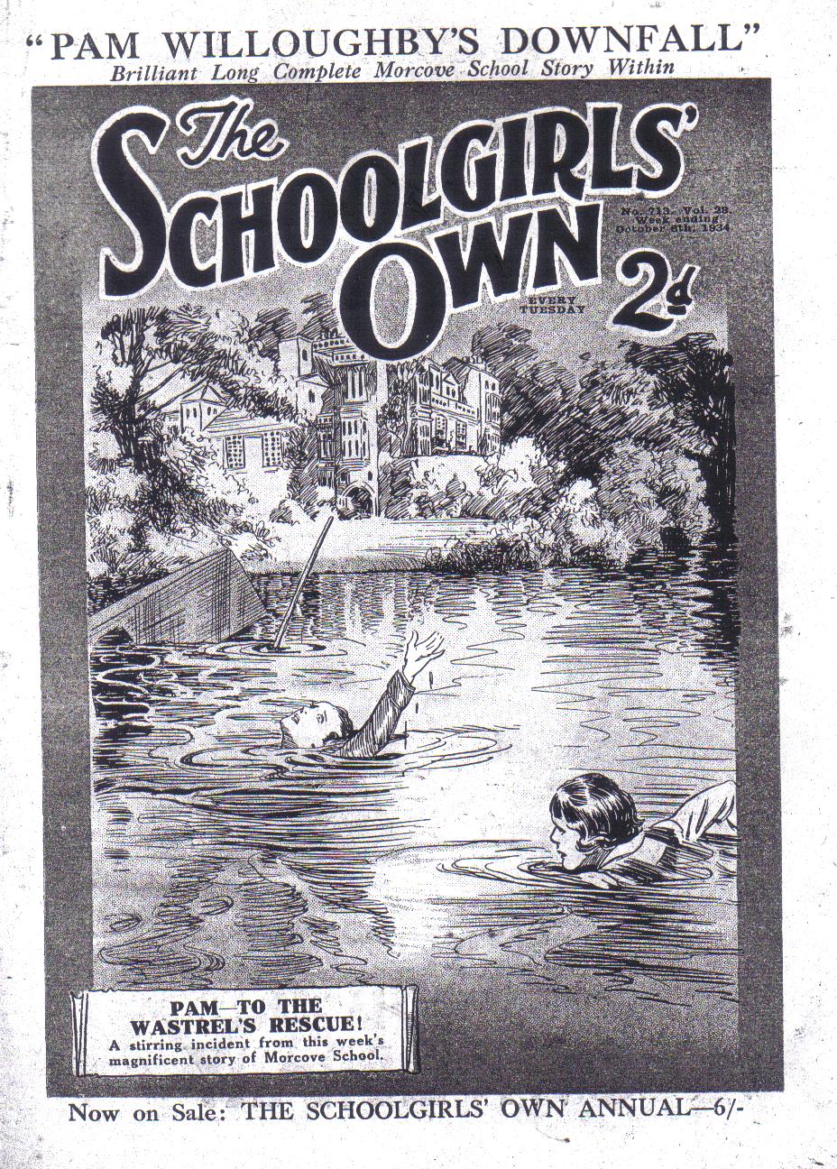 In this story, Betty has been in a car accident which results her being in hospital and then she has long convalescence. Part of Betty’s convalescence takes place in the Headland Hotel, where Mrs Barton brings her to stay. Pam is made Form Captain. Morcove’s Fourth Form have a new Mistress, in the name of Miss Kitten. Unbeknown to Morcove, this Miss Kitten is bogus, having assumed the identity of her decent, upright sister. This is not made known to the reader at once. Miss Kitten takes on a hatred of Pam (I don’t have the lead up to this, so don’t know the reasons why). For some reason, Miss Kitten shows a favouritism towards the Denvers, which is inexplicable to the Morcove girls. Edna Denver is now attracted to Billy Charters, Pam’s cousin. Pam, after some trouble caused, aided and abetted by Billy, the scheming Denvers and Miss Kitten’s vitriolic personality, is ostracised by her Morcove chums, and so she decides to go home to Swanlake. During the afternoon, she meets up with Jimmy Cherrol and has a heart to heart talk. After Jimmy has gone, she is wandering up the drive when she hears a cry for help. It is Billy. He has been out on a punt on Swanlake’s lake when it capsizes. Billy can’t swim. She jumps in and rescues him from drowning.