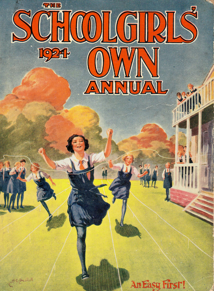In 1922 the Amalgamated Press decided to publish a new girls annual in response to the success of the School Friend and more lately the Schoolgirls' Own weekly papers and also apparently many requests to them to publish an annual. Like the boys' Holiday Annual it was a full bodied collection of school and adventure stories but for girls, written by the usual array of AP male staff masquerading as women authors - Renee Frazer, Joan Vincent, Gertrude Nelson, Mildred Gordon etc. Cliff House stories written by "Hilda Richards" took the lead and appeared for a few years but then starred in its own Annual from 1927, logically called the School Friend, whereas the Morcove tales written by "Marjorie Stanton" appeared every year until bowing out in the 1939 annual. The AP records on authorship were incomplete when Lofts and Adley were listing the titles but it's reasonable to assume that Horace Phillips wrote all the Morcove stories and Reg Kirkham or L. E. Ransome wrote of Cliff House. The Schoolgirls' Own Annual was published in August/September with Christmas sales in mind and throughout the 1920's it had a cover illustration by Alfred Bestall, later The Rupert Artist, and the covers continued to be colourful and eye-catching throughout the '30's to the end. In 1943 the last Schoolgirls' Own annual appeared - by then the AP had had to consolidate all the girls stories into one story paper/annual, the Girls' Crystal, which with the School Friend annual marched on for many years to come.